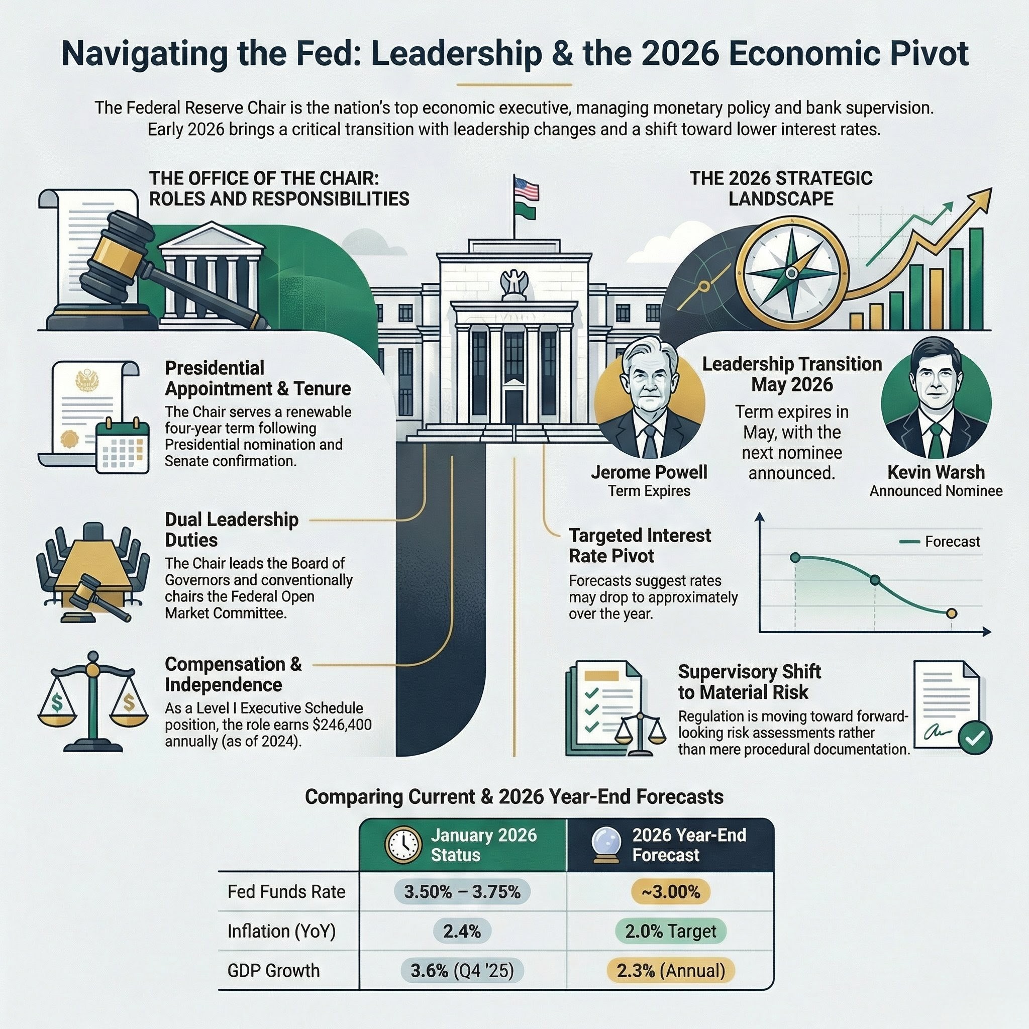 These documents provide a comprehensive look at the leadership, governance, and economic strategy of the United States Federal Reserve. They detail the Chair’s administrative duties and appointment process, alongside historical records of the individuals who have managed the central bank. Forward-looking financial analysis suggests that while officials remain divided on future interest rate adjustments, a shift toward lower borrowing costs is anticipated throughout 2026. Current reports from various districts highlight stable but cautious economic conditions influenced by persistent inflation and the impact of trade tariffs. Furthermore, the Federal Reserve is actively modernising banking regulations to improve institutional safety while supporting community-based lending. Together, these sources illustrate the complex balance between maintaining price stability and promoting maximum employment within the American economy.