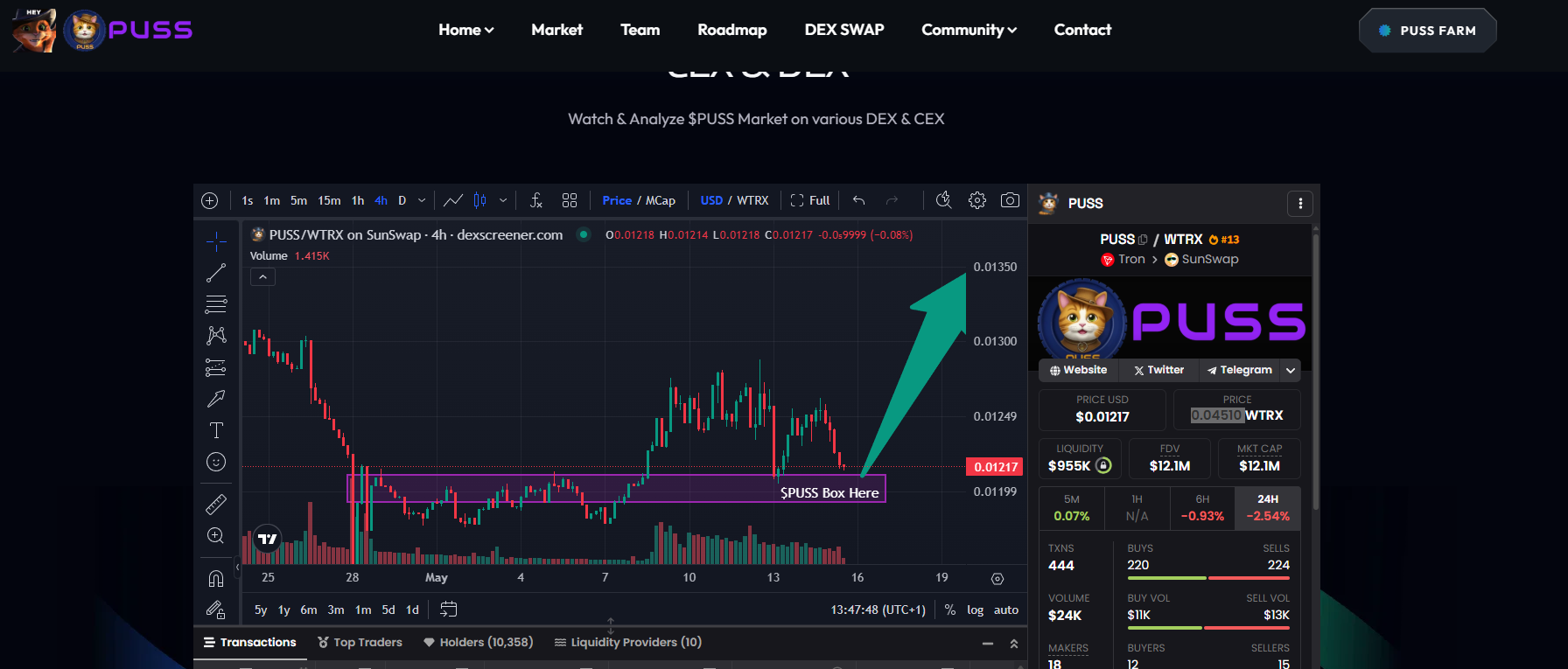 The current price of $PUSS stands at **0.04509 TRX,** which was **0.04775 TRX** on the last analysis; the token's price has decreased by **2.73%**. With liquidity **of $956K** and a **24-hour trading volume of 16,574.43 TRX**, the market cap has now crossed above $14.32 M and is currently at **$12.1M** in total market capitalisation. Getting to $20M is still a matter of time, and we are not losing confidence, especially here.