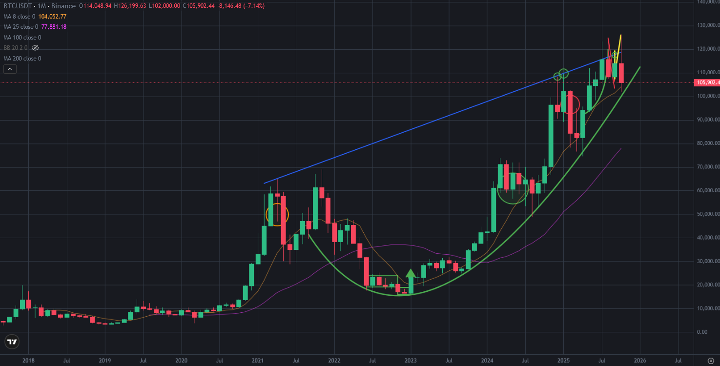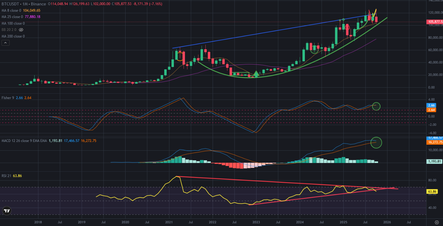 Here you can see the indicators on monthly chart of Bitcoin price. I pointed this chart a few days ago. RSI Indicator stuck between up and downtrend lines. If Bitcoin price closes the month below 111K, we will see breaking down on uptrend line of RSI Indicator. MACD Indicator is also trying to reverse down as Fisher Indicator. If we see reversing down on these major indicators, we will enter mega bearish season.