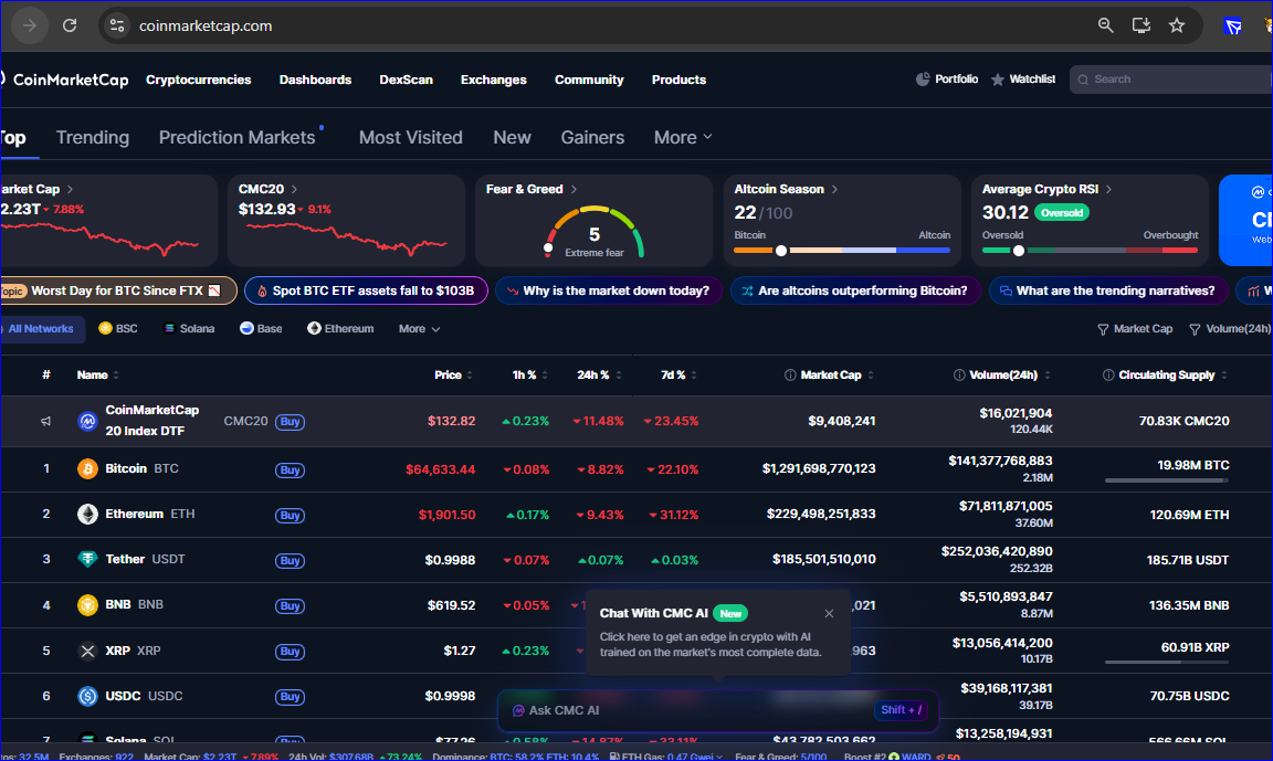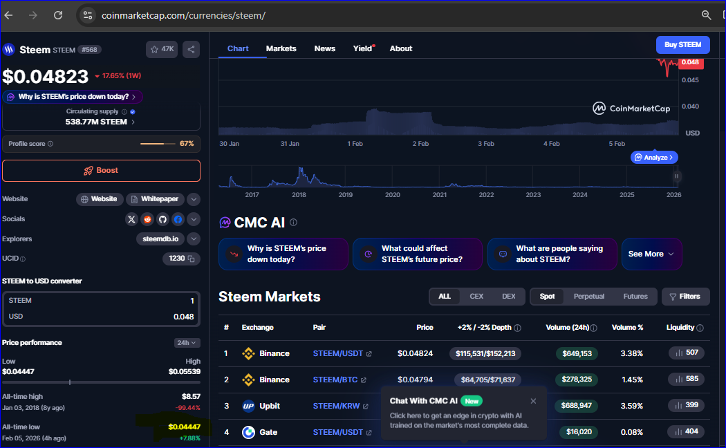 Steem reached a new All Time Low today, $0.04447, this is catastrophic, a really unthought-of downfall. Of course every single crypto token is facing the same fate at this moment. Just think of it, Bitcoin is below $65,000.00, after reaching $126,000.00, sounds incredibly bad. Plus the market cap which breached 3 Trillion USD is now at 2.23 Trillion dollars. I bet no one saw this coming. Well at least no one if this dump is not artificial.