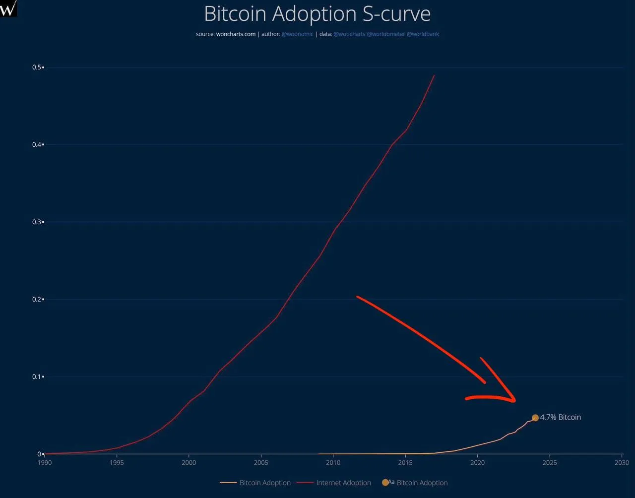 This chart says everything. Bitcoin global adoption just hit 4.7%, the same level the Internet had in 1999. Let that sink in. We are basically in the dial-up phase of Bitcoin, when most people still think it’s weird, unnecessary, or just for “tech guys.” But look what happened to the Internet after 1999.