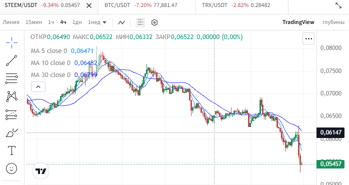 Крипта опять повалилась вниз, уже 77 тыс за биткоин дают, а за стим - 0.054.