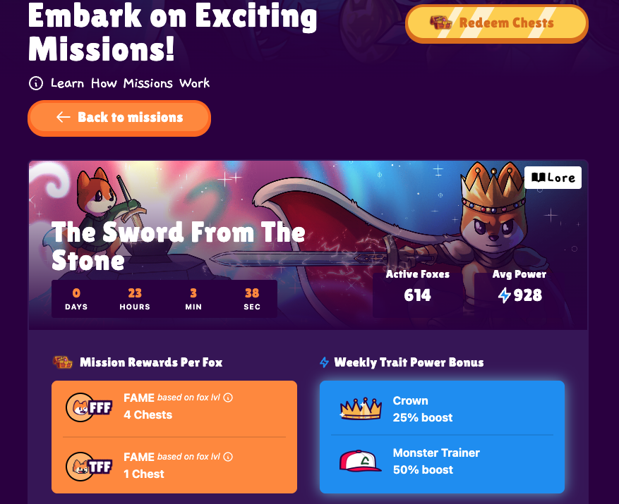 보유한 여우 NFT와, 여우의 집을 형상화한 Dens NFT를 미션에 참여시킨 후 일주일 뒤 성공 여부에 따라 보상을 받게 됩니다. 실패하더라도 참여만으로 Fame 포인트가 쌓여 캐릭터를 성장시키는 재미도 있습니다.