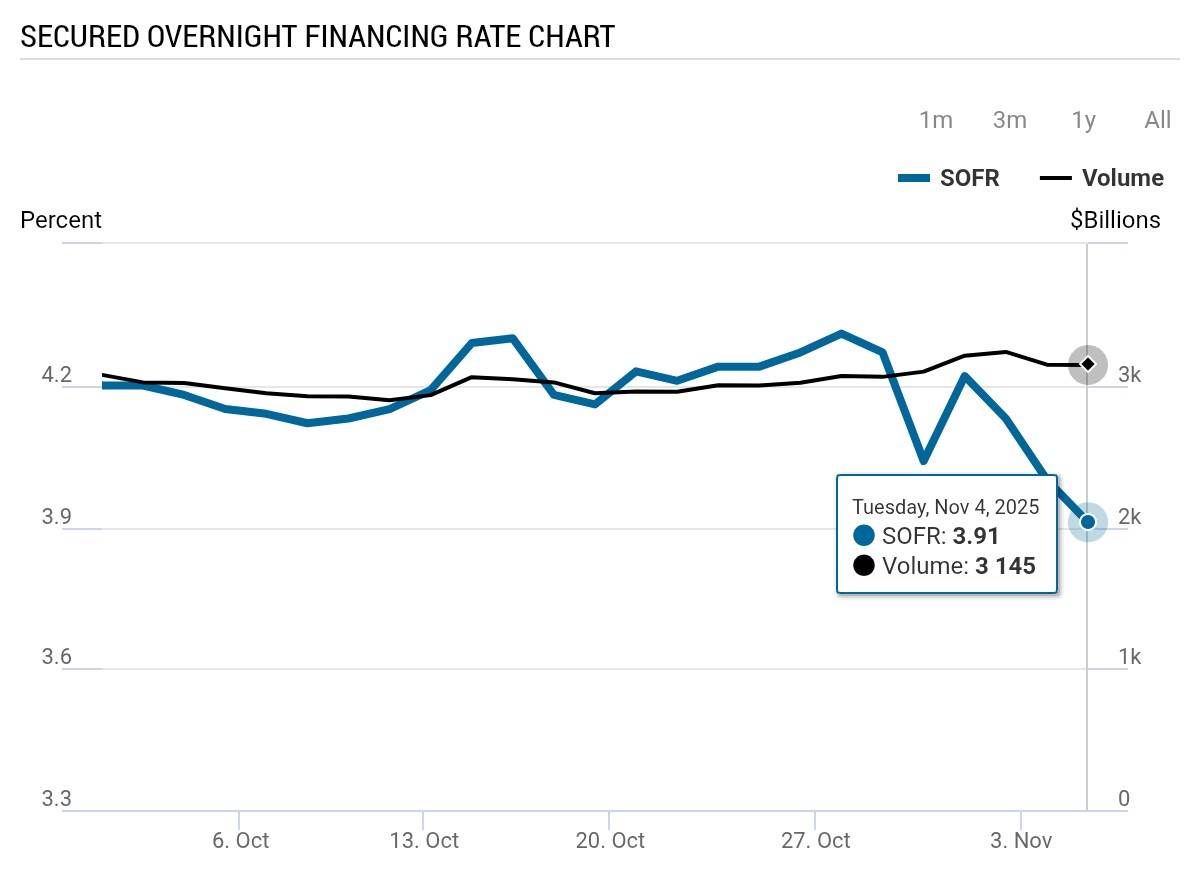 SOFR은 10월 중순에 높은 변동성 속에서 4.2% 넘는 spike를 찍었다. 이후 하락하여 3.91%로 내려왔다. 현재 안정적 수준.