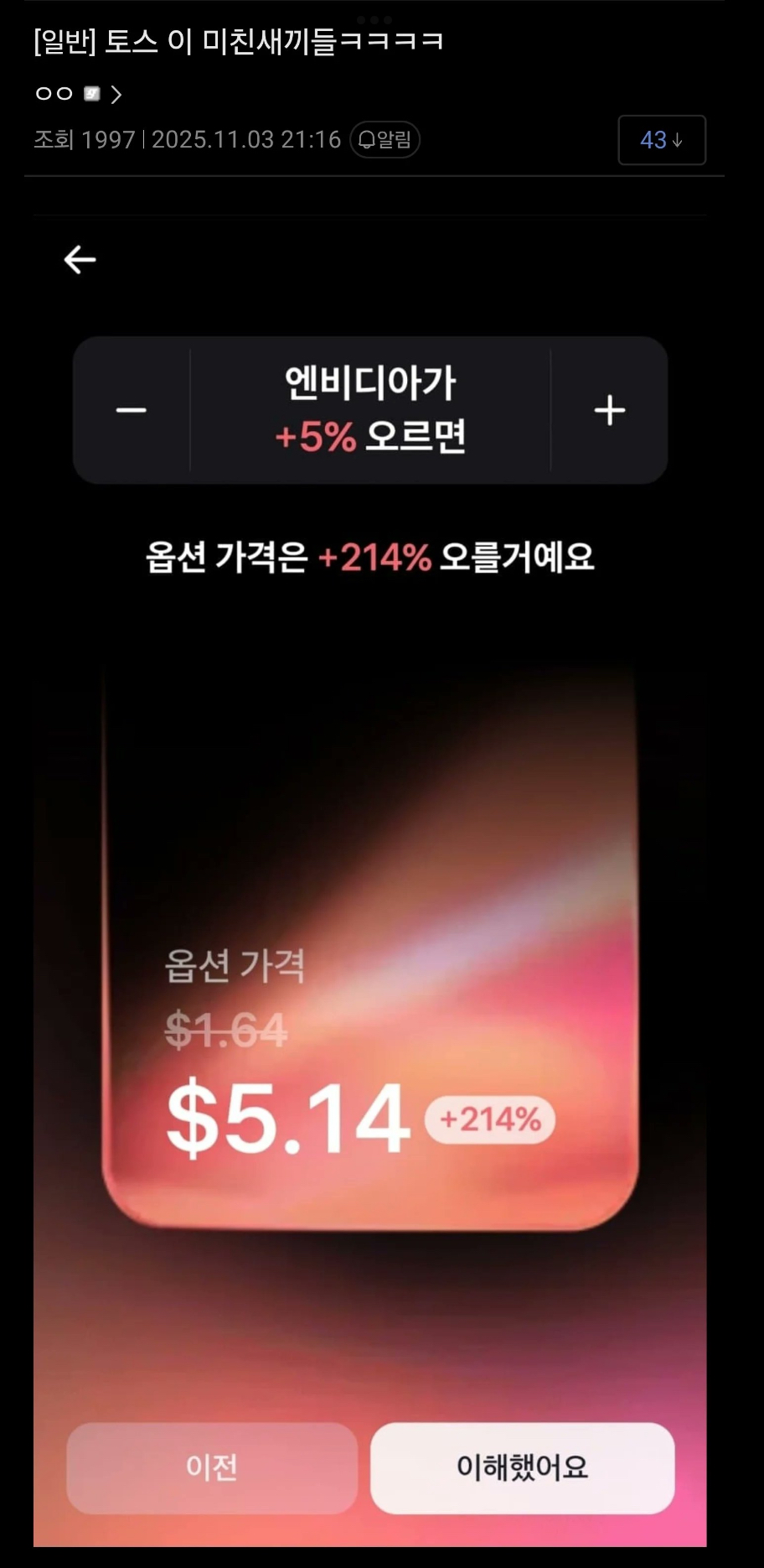 토스가 옵션 마켓에 대한 문턱을 낮추어 일반 리테일 투자자를 끌어들이기 위해서 UI를 예쁘게 만들고 예상 수익률등을 아주 보기 좋게 보여주고 있다.