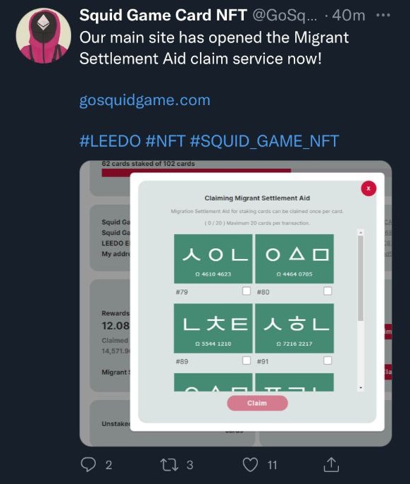 오징어게임이 전세계적으로 인기를 얻던시기, 어느 한국 개발자 혹은 온라인 개척자가 Squid Game Card NFT를 발행해서 엄청난 인기를 끌었다.