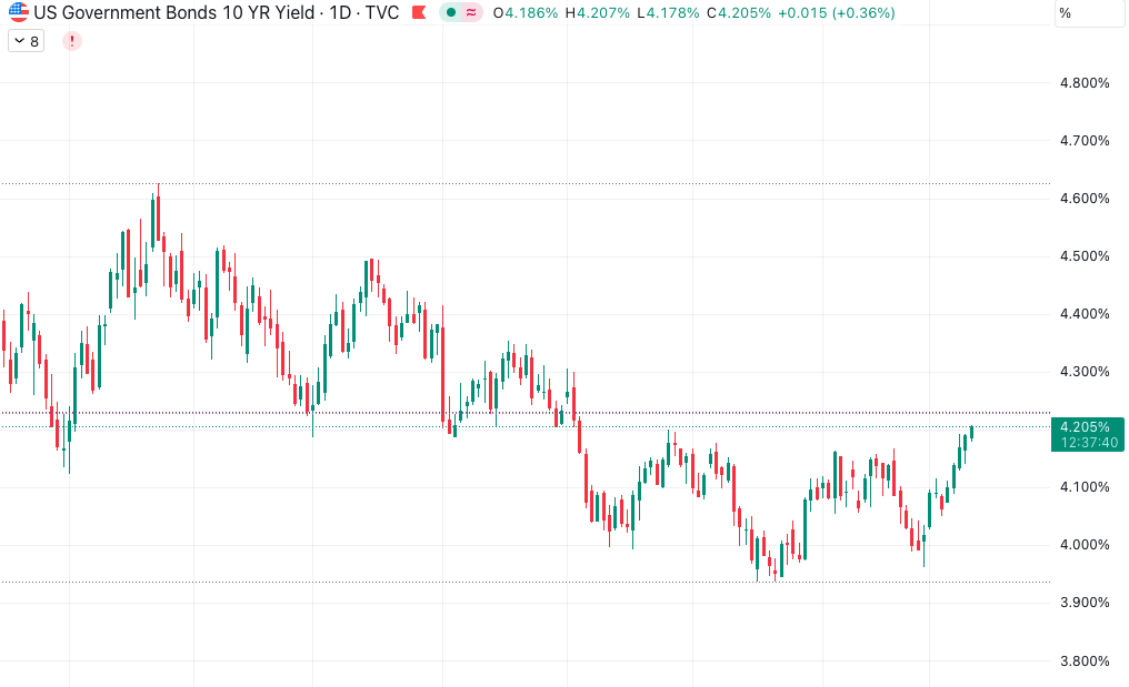 10년물 미국채 이율이 상승하고 있다. 한국시간 2025년 12월 10일 현재 4.205%.