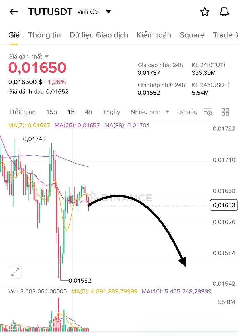 TUT is testing resistance near $0.01650, failing to break higher. Rejection here could push price back toward $0.01555, with a further drop to $0.01520 if selling persists.
