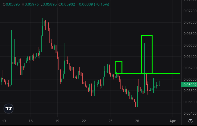 А чотири години показують детальнішу картину й вона шось менш втішна, бо імпульс росту був більший, але порівнюючи його із попереднім, який теж швидко розпродали, цей протягом 15хв вигребли ведмеді. При цьому опір 0.0612 (приблизно, залежно від біржі). Не пройшли. Тож воно стоїть і дума, щоб його ще утнуть. Якщо скзать про найближчий рість, то він уже був, тож скоріше за все потопчуть в бік із тестом підтримки.