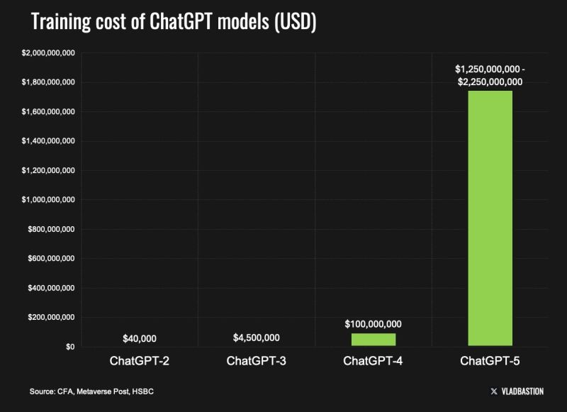 Se estima que el coste total de formación de ChatGPT-5 se situó entre 1.700 y 2.500 millones de dólares, según una publicación de mayo de 2024 en X del analista financiero certificado Vladimir Kiselev.