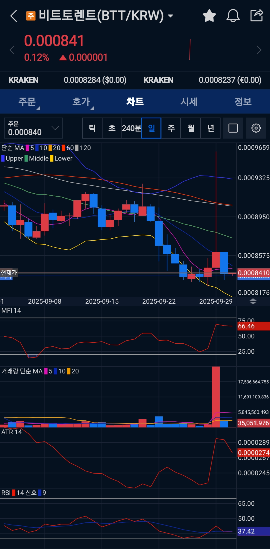 - BTT는 0.000835~0.000852 박스에서 재수렴 중이며, 거래량이 다시 붙지 않으면 박스 공방 지속 가능성이 큽니다.