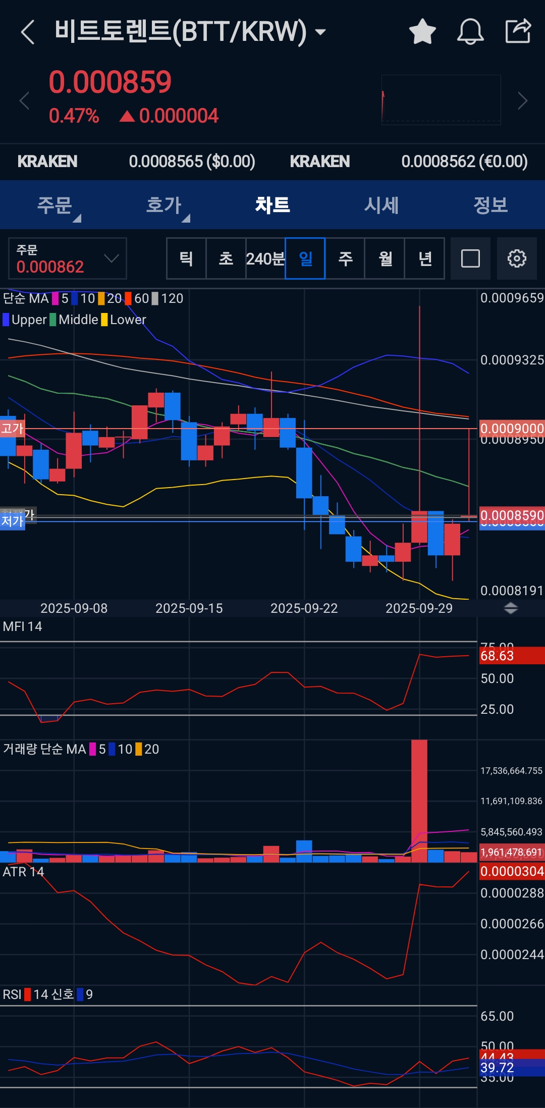 - 단기 저항: 0.000862~0.000865(최근 상단 박스·밴드 상단 근접), 상위 저항 0.000890