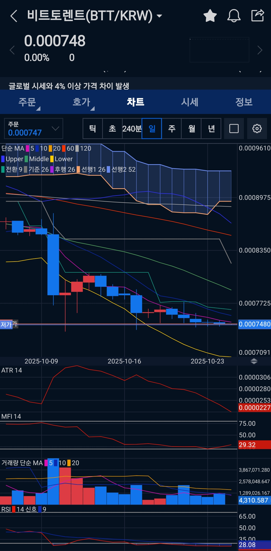 BTT/KRW 차트(이미지 기준, 시점: 2025-10-25 오전 09:11)를 바탕으로, 요청하신 대로 “꼼꼼하고 단계적이며 절차적인 사고” 흐름으로 분석해 드리겠습니다. 목표는 (1) 상위 방향성 판단 → (2) 중기 신호 확인 → (3) 단기 진입·손절 규정화 → (4) 실전 대응 플랜 제시입니다.