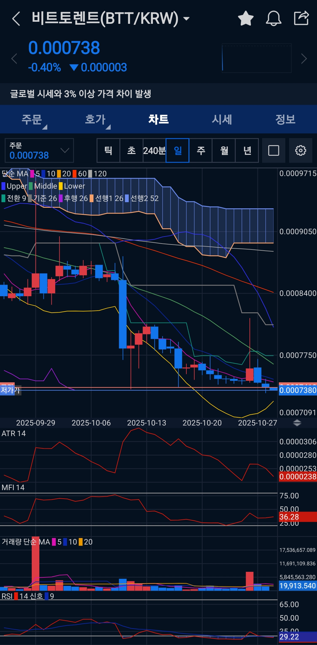 비트토렌트(BTT/KRW) 60분·240분·일봉 차트(현재 0.000738 기준)를 바탕으로 요청하신 대로 “꼼꼼하고 단계적이며 절차적인 사고” 흐름으로 결과만 요약·제시하겠습니다. 내부적 사고 과정은 제공하지 않으며, 제가 확인한 항목과 결론·실전 규칙을 단계별로 정리합니다.
