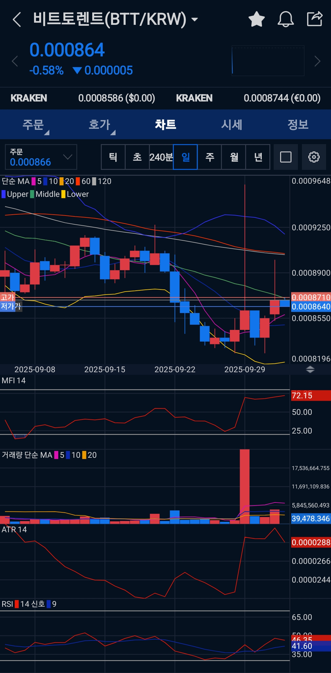 - 해석: “돌파 에너지 부족한 상단 공방.” 0.000870 돌파에 거래량이 필요합니다.