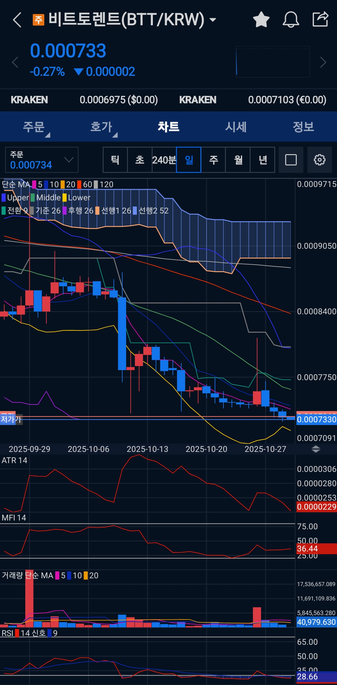 비트토렌트(BTT/KRW) 차트(60분·240분·일봉, 시점 2025-10-30 오전 기준)를 절차적·단계적으로 분석한 결과입니다. 결론부터 말씀드리면 — 상·중·단기 모두 하방 우세 구조가 유지되고 있으며, 현재는 0.00073~0.00074 부근에서 단기 지지·횡보 중입니다. 확인 신호(거래량 동반 연속 양봉, 240분·일봉의 구름/MA 돌파)가 나오기 전까지는 관망을 기본으로 하고, 단기 스캘프는 소규모·엄격 손절로만 접근하시길 권합니다.