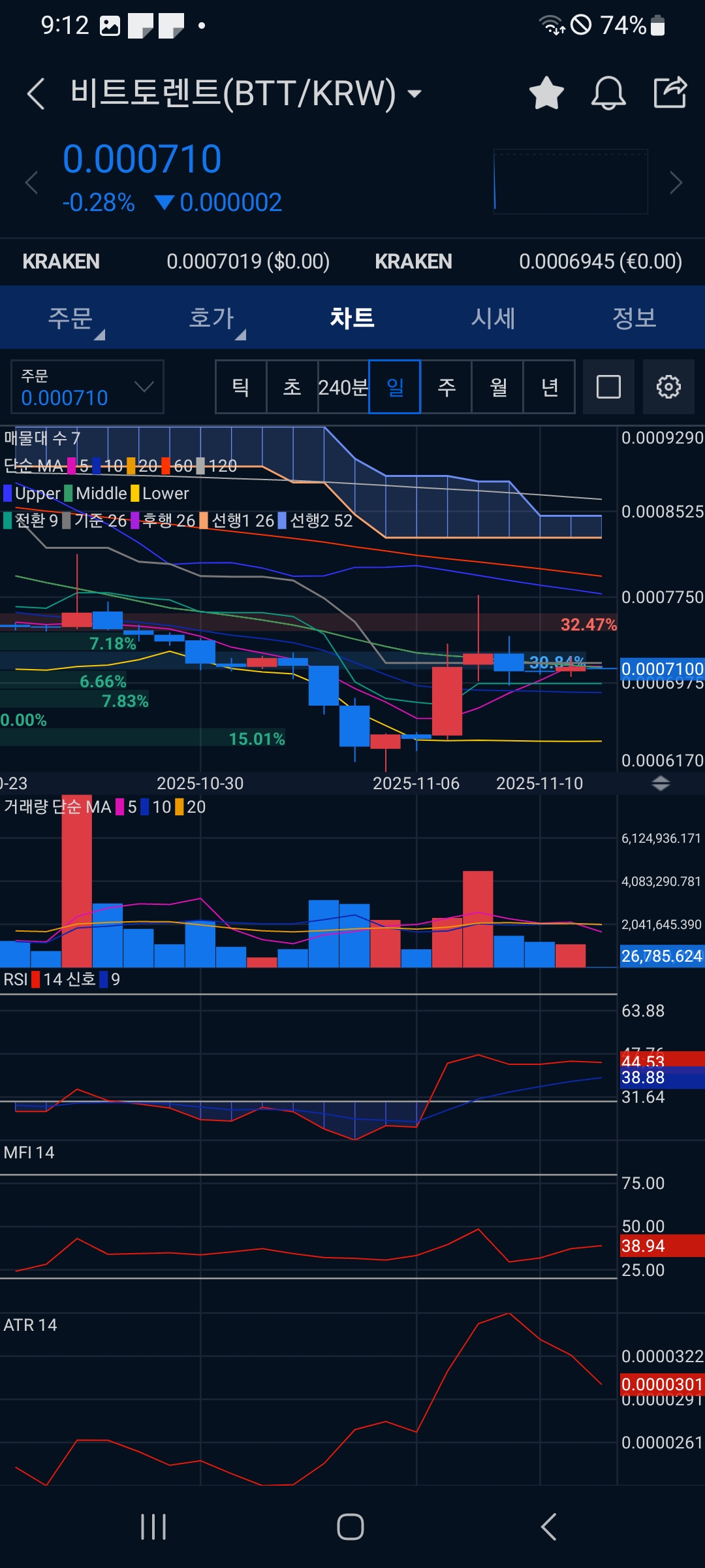 BTT/KRW(60분·240분·일봉) 차트를 단계적·절차적 사고로 분석해 드리겠습니다 — 추세 판정, 거래량·모멘텀 확인, 지지·저항 도출, 매매 시나리오, 리스크 관리 순으로 정리하겠습니다.
