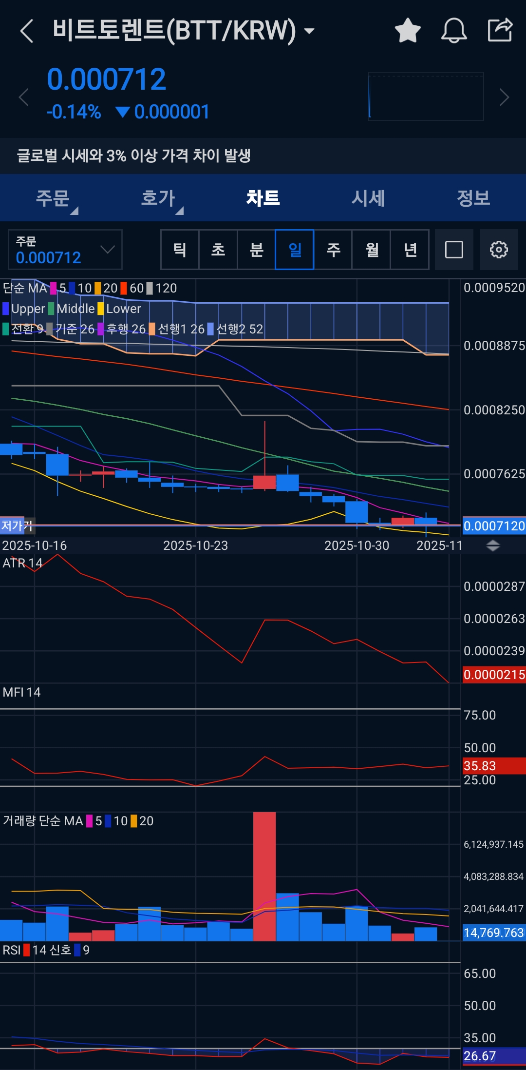 - 확인 항목: 일봉 캔들 패턴(아랫꼬리, 작은 몸통), 거래량 바, RSI·MFI(일·60분), ATR(일·60분).