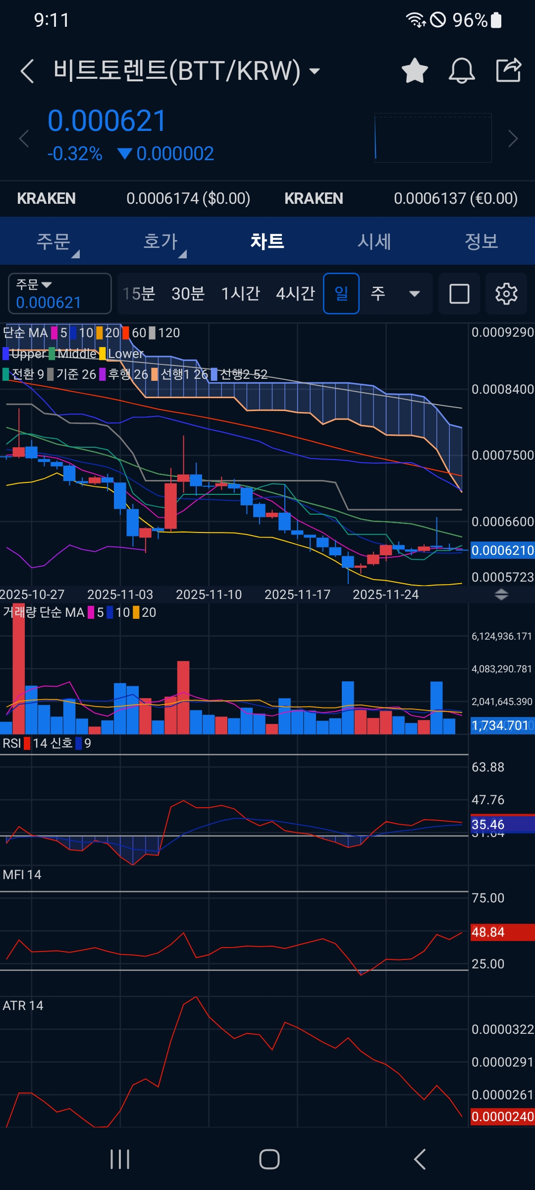 요청하신 2025-11-30 오전 스냅샷 기준 BTT/KRW(비트토렌트) 차트를 다중시간대(1시간·4시간·일봉)로 단계적·절차적 사고(관찰 → 해석 → 규칙 기반 행동)로 꼼꼼히 분석해 드립니다. 모든 수치·판단은 제공하신 스크린샷을 시각 판독한 추정치이므로 실제 매매 전 실호가·호가창으로 최종 확인하십시오.