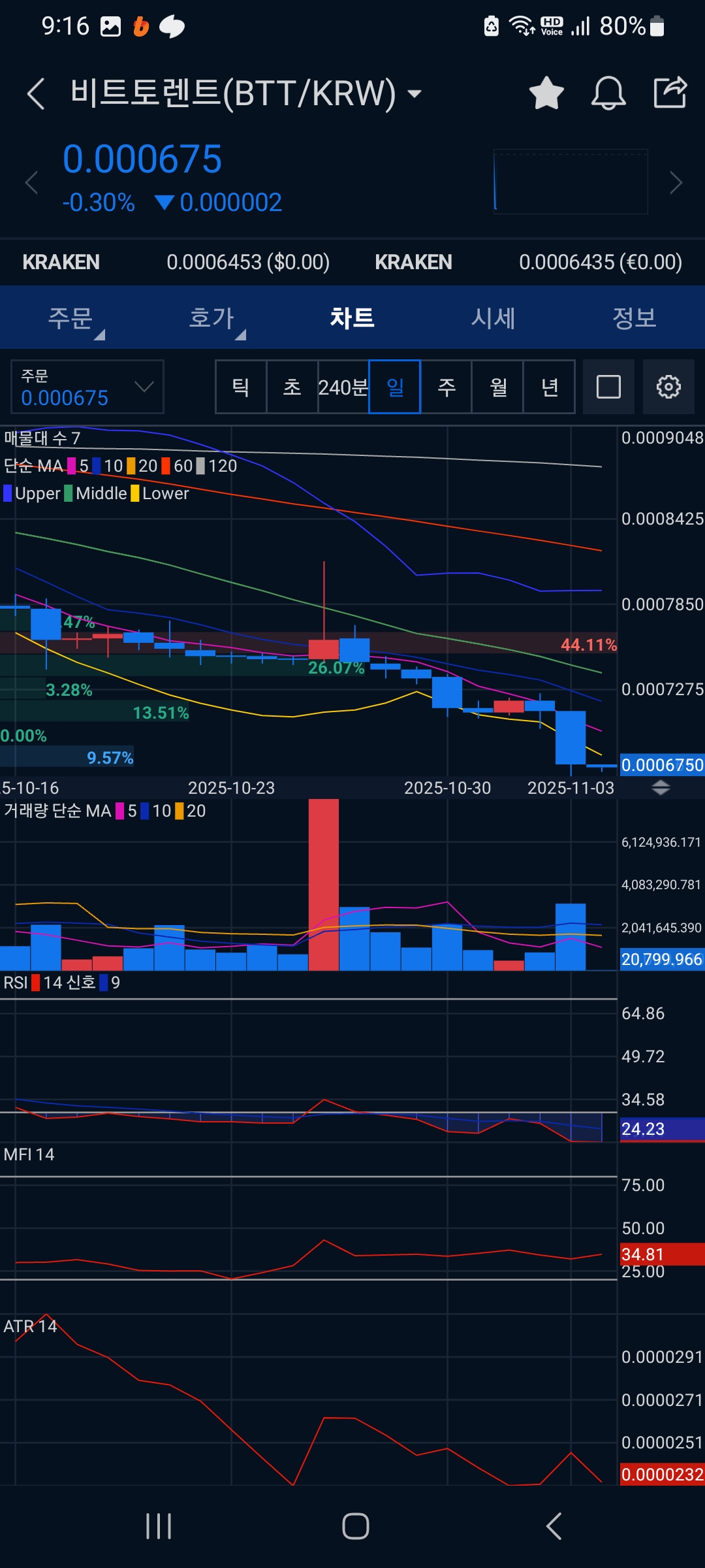 비트토렌트(BTT/KRW) 차트(60분·240분·일봉)를 바탕으로 요청하신 대로 “꼼꼼하고 단계적이며 절차적인 사고” 흐름으로 분석해 드리겠습니다. 내부 추론의 원문(생각 그 자체)은 제공하지 않고, 제가 어떤 항목을 어떤 순서로 확인했고 그 근거로 어떤 결론과 실전 규칙을 도출했는지 단계별로 명확히 정리해 드립니다. 시점 기준은 이미징된 캡처 기준(2025-11-04 오전 근접)입니다.