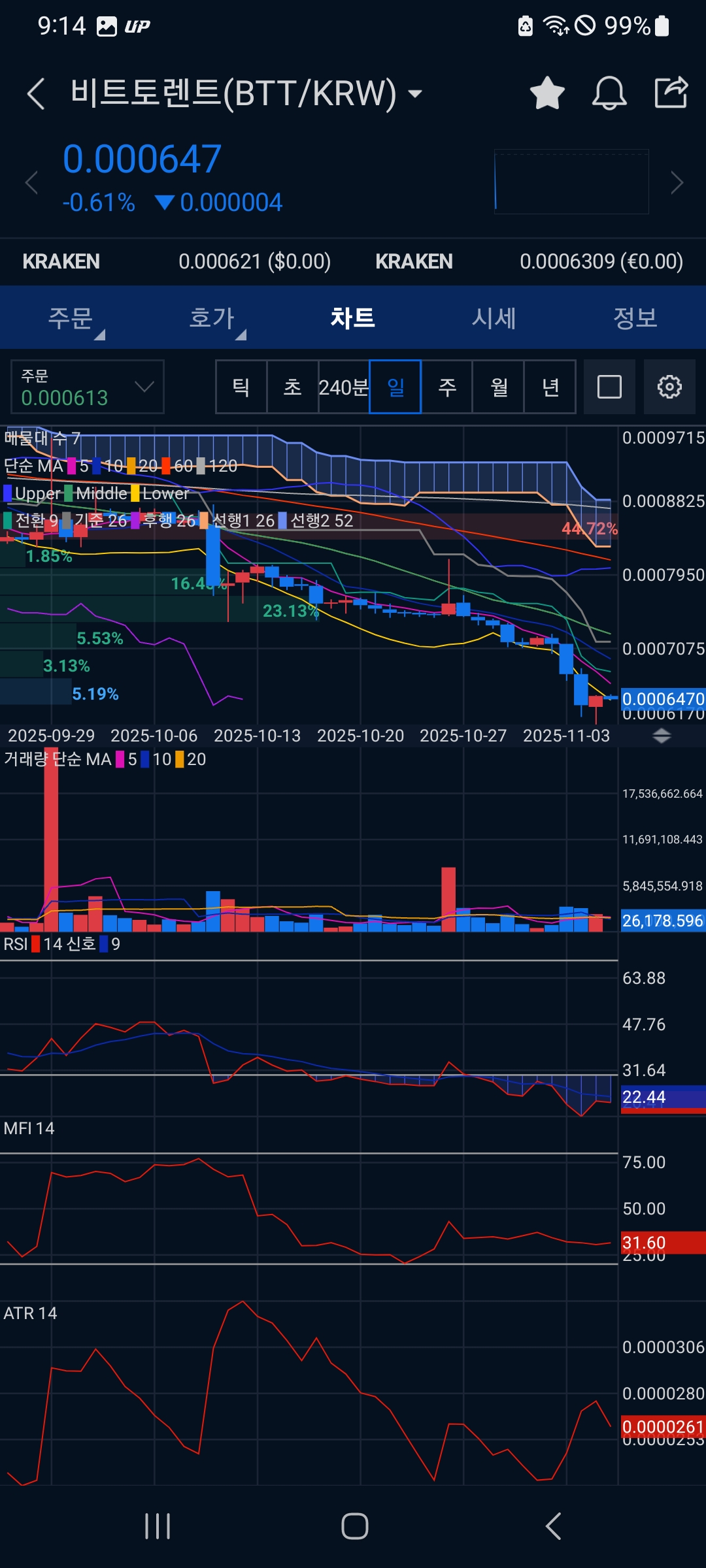 현재(스크린샷 기준 가격 0.000647) BTT는 단기 반등 국면으로 보이나 중·장기 저항이 여전히 강하고 거래량·모멘텀의 일관성 확인이 필요합니다. 보수적 접근(소규모 분할 진입 + ATR 기반 손절 권장)을 먼저 권합니다.