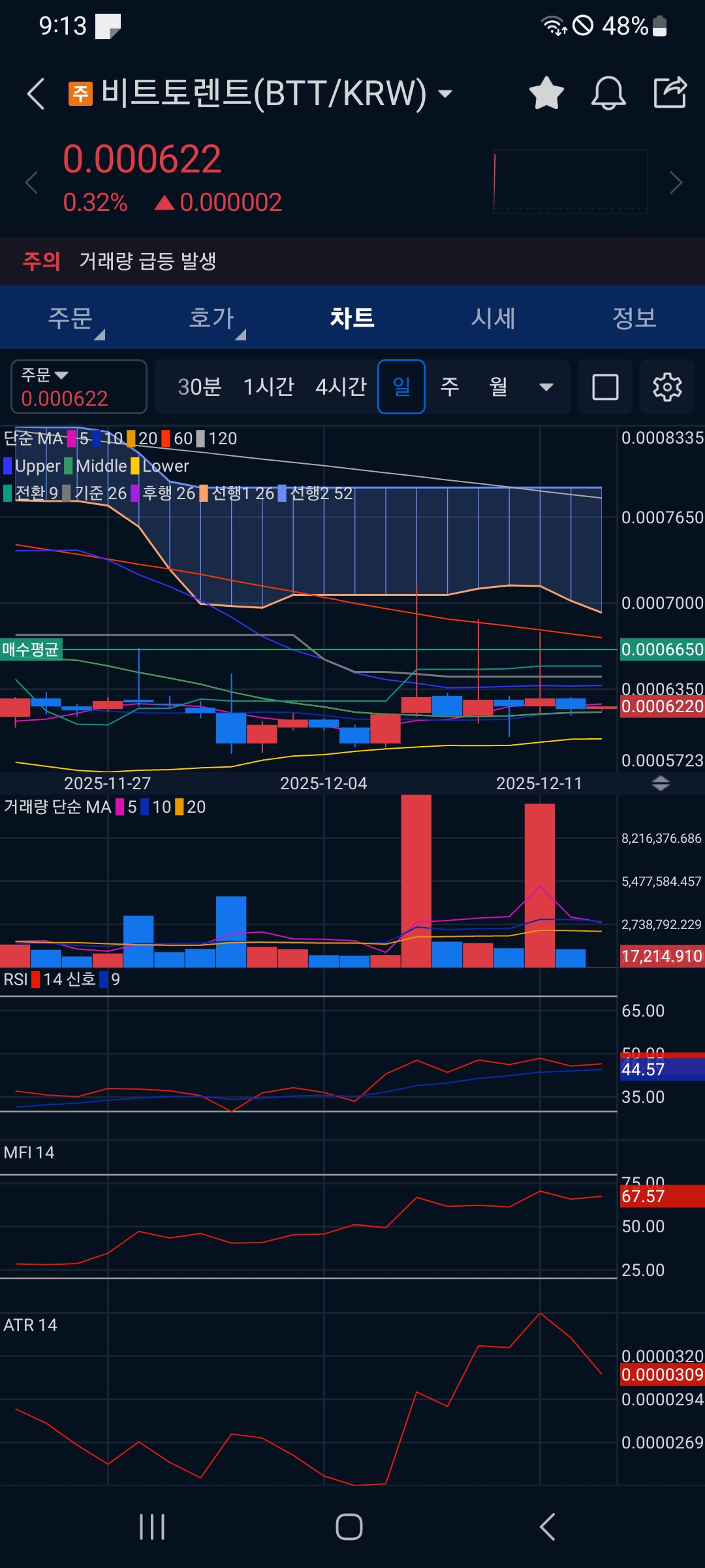 제공하신 스크린샷(2025.12.13 오전 기준)을 바탕으로 분석한 결과 — BTT/KRW는 일봉·4시간에서 상위 저항 압력이 여전한 가운데 1시간에서는 거래량 스파이크 이후 박스권 정리 및 약한 약세(모멘텀 소멸) 신호가 관찰되어, 거래량·모멘텀 동행이 확인될 때만 규칙적으로 진입하는 보수적·절차적 접근을 권합니다.