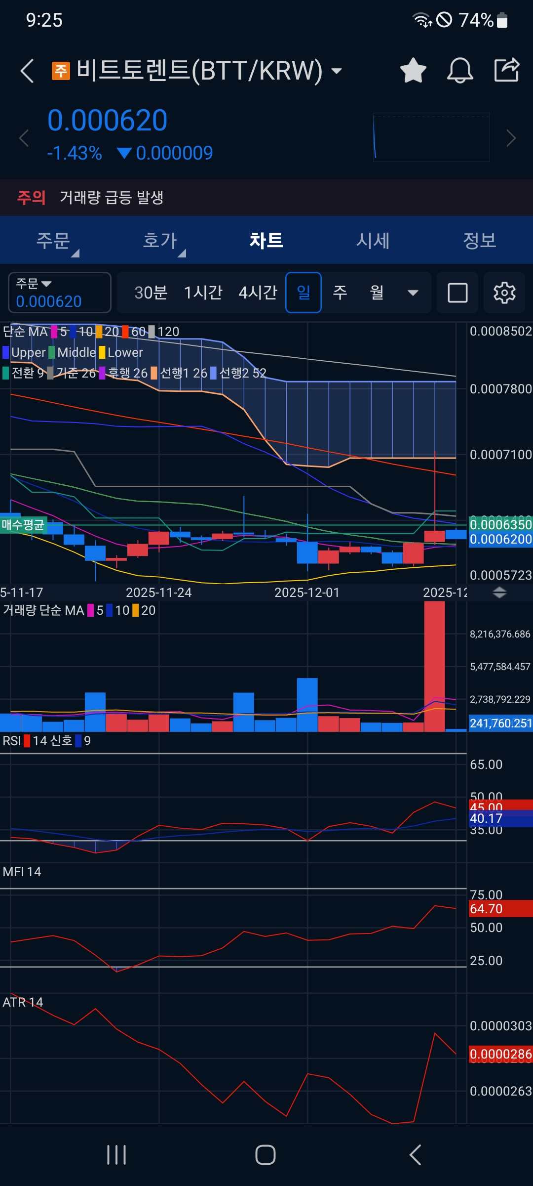 2025.12.08 오전 차트 기준 BTT/KRW는 최근 대량 거래(입금·거래량 급증) 이후 단기 조정·횡보 국면에 진입한 상태로, 1시간·4시간·일봉 모두 다중시간대 관점에서 아직 확실한 상승 전환 신호는 부족하므로 보수적 관망 또는 볼륨·모멘텀이 확인되는 순간에 한해 단기 롱·스캘프 또는 리트레이스 숏을 고려하는 것이 바람직합니다.