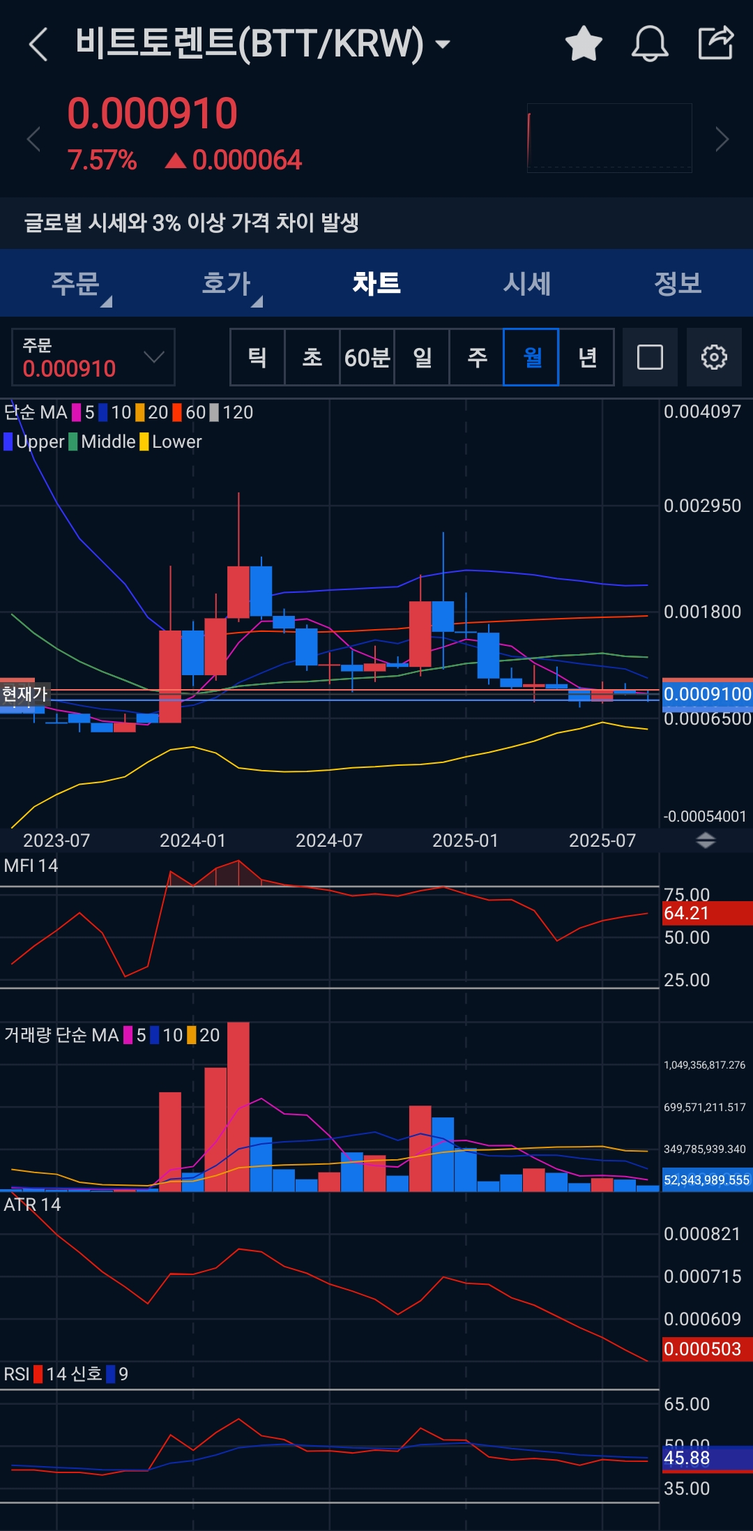 - 장기 박스 하단 영역(0.00085~0.00095)에서 반등 캔들 시도. 월봉 RSI는 40대 중반, 장기 과열은 전혀 없는 상태라 “반등 공간”은 있으나, 추세 반전 확정까지는 추가 확인이 필요합니다.