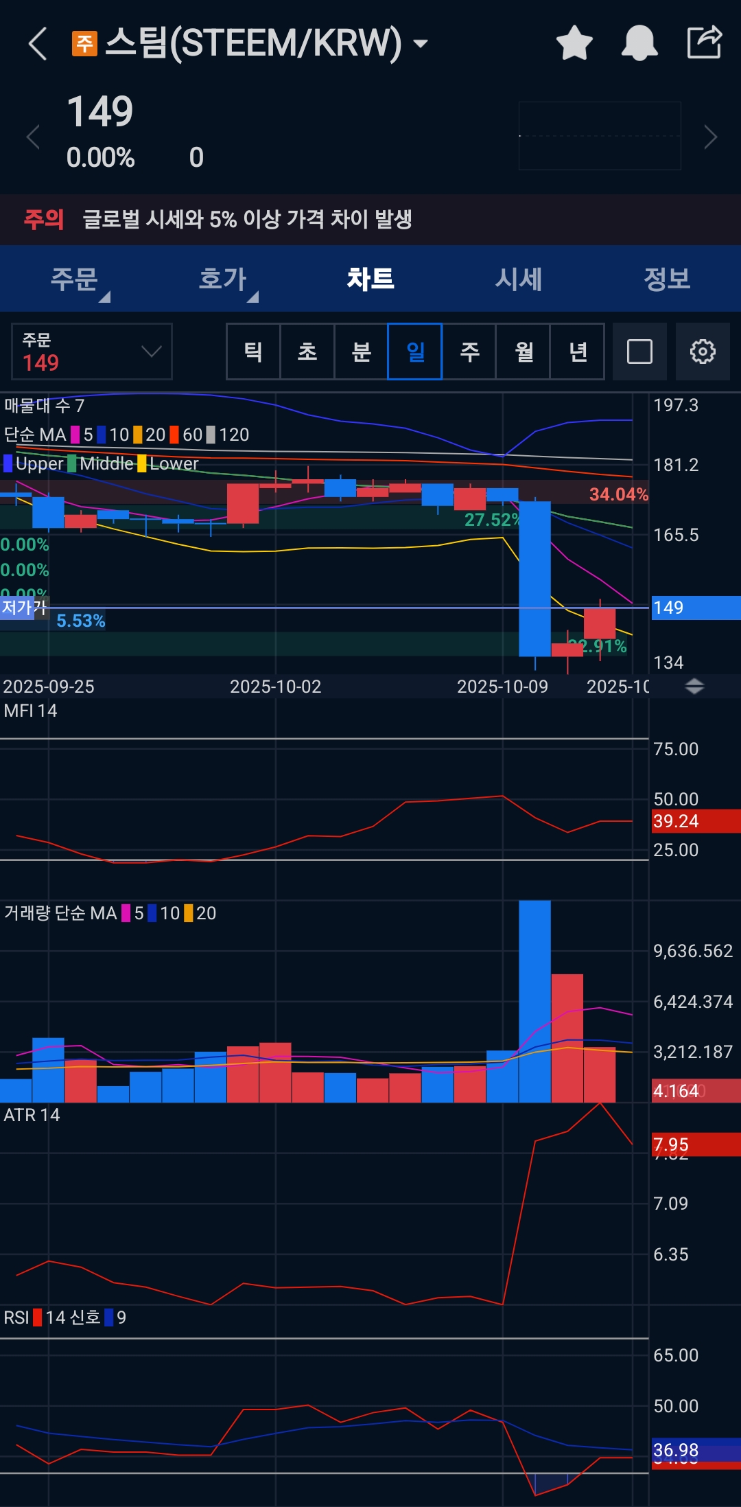 - 이벤트 리스크: “글로벌 시세와 가격 괴리” 경고가 표시되어 변동성 급등 가능성. 시장가보단 지정가·스탑 사용을 권장합니다.