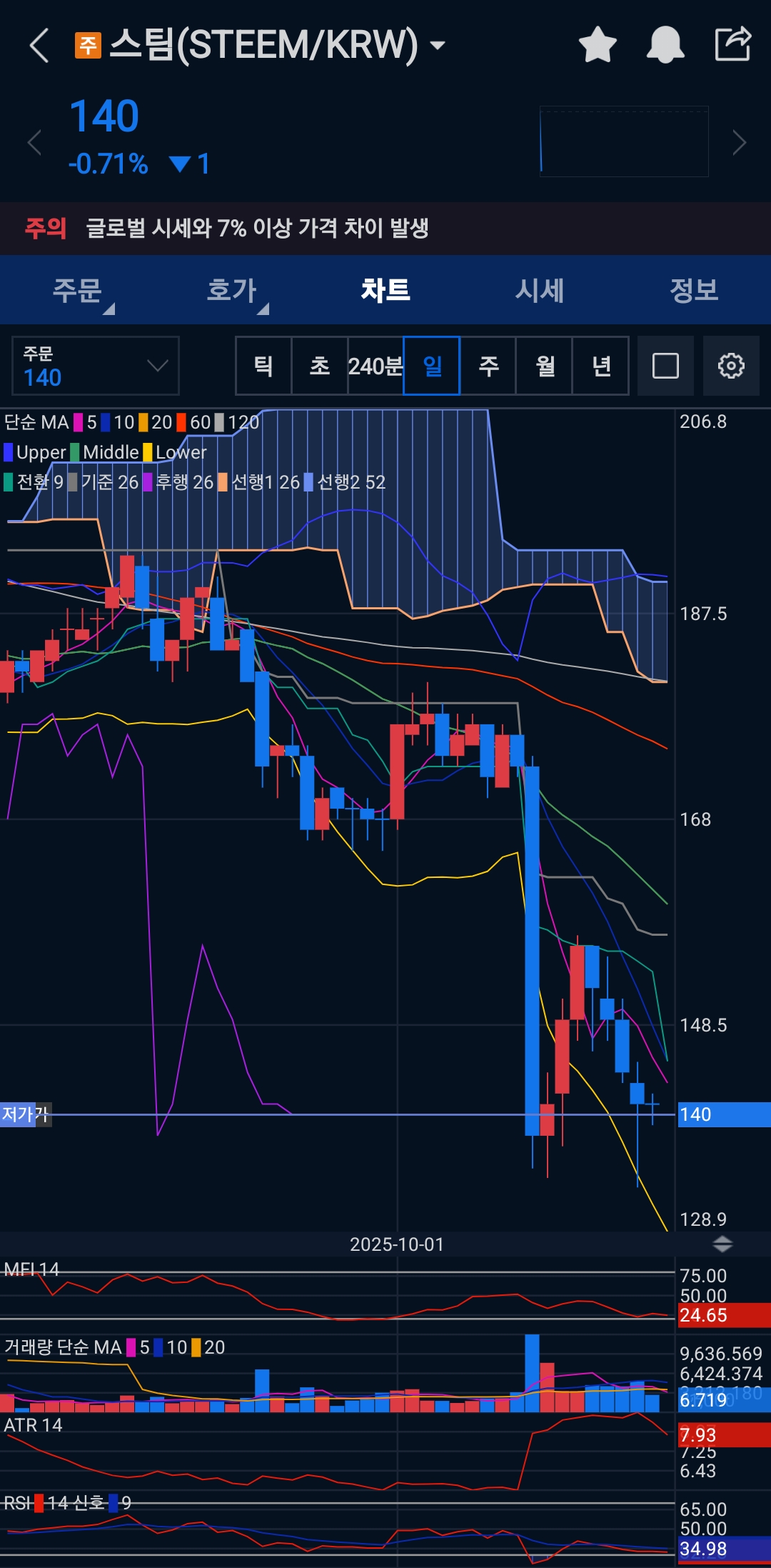 - 현재가 근처 박스권 횡보 후 저점(약 133~139 사이)에서 반등하는 캔들 연속 관찰. 현재 표시 140.