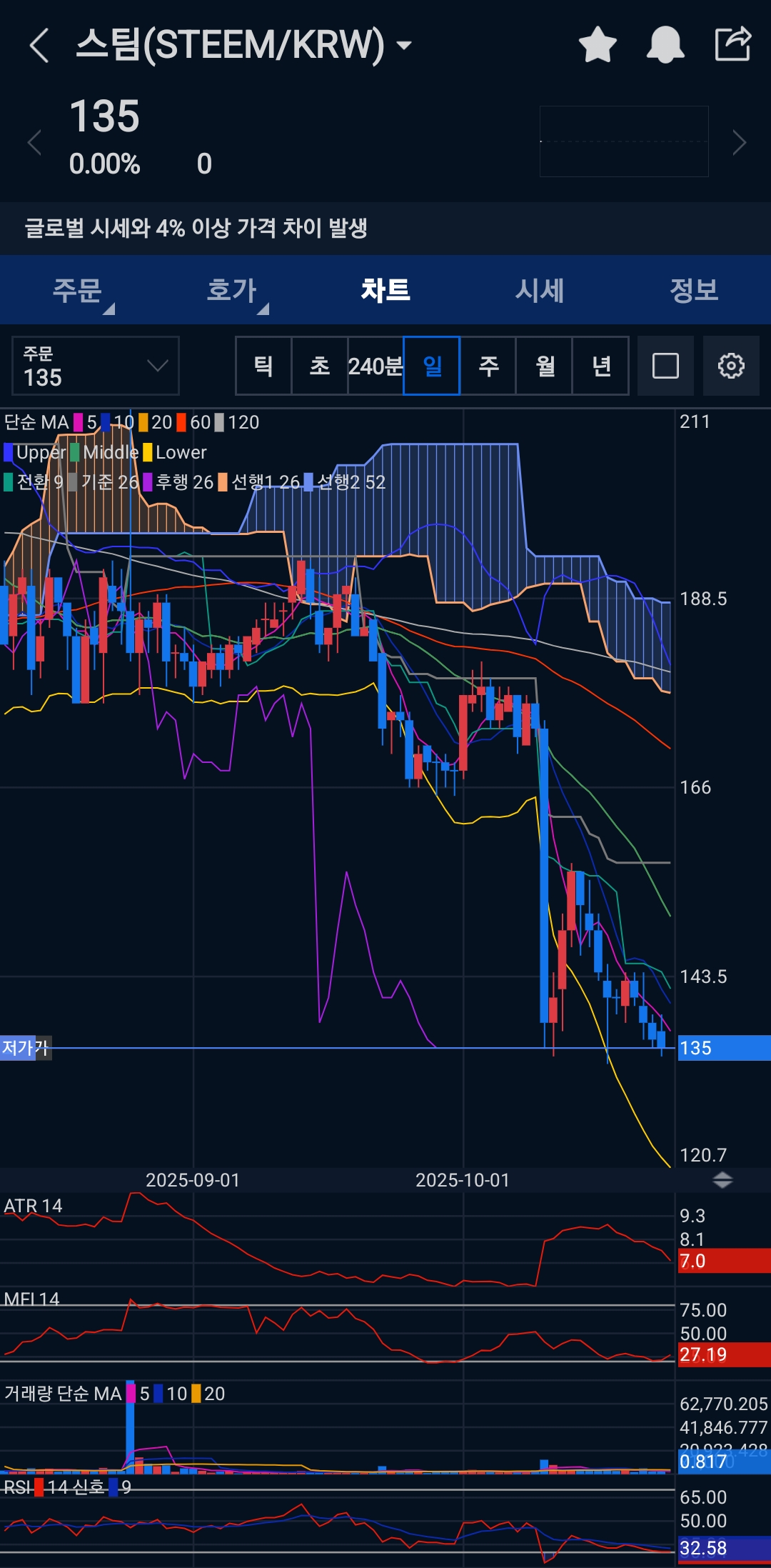 STEEM/KRW(현재 표시 135원 기준) 차트를 3단계(일봉→240분→60분)로 순차적으로 점검하며, 무엇을 왜 보는지 절차적 사고 흐름에 따라 꼼꼼히 분석해 드리겠습니다. 결론 → 시간축별 관찰 → 지지·저항 → 조건부 매매 시나리오 → 리스크 관리 순으로 정리합니다.