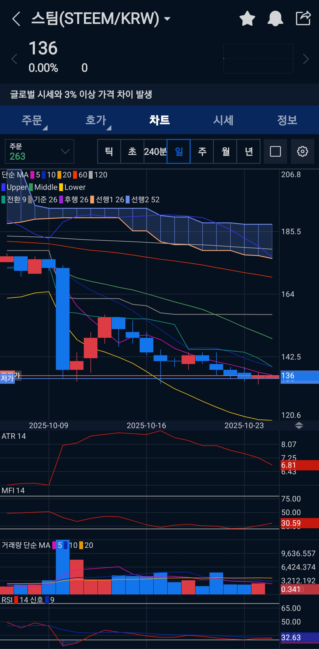 - 관찰한 항목: 구름 하단과 중기 MA들이 가격을 압박. 여러 번 반등 시도가 구름·MA 레인지에서 멈춤. 거래량 회복은 일시적.