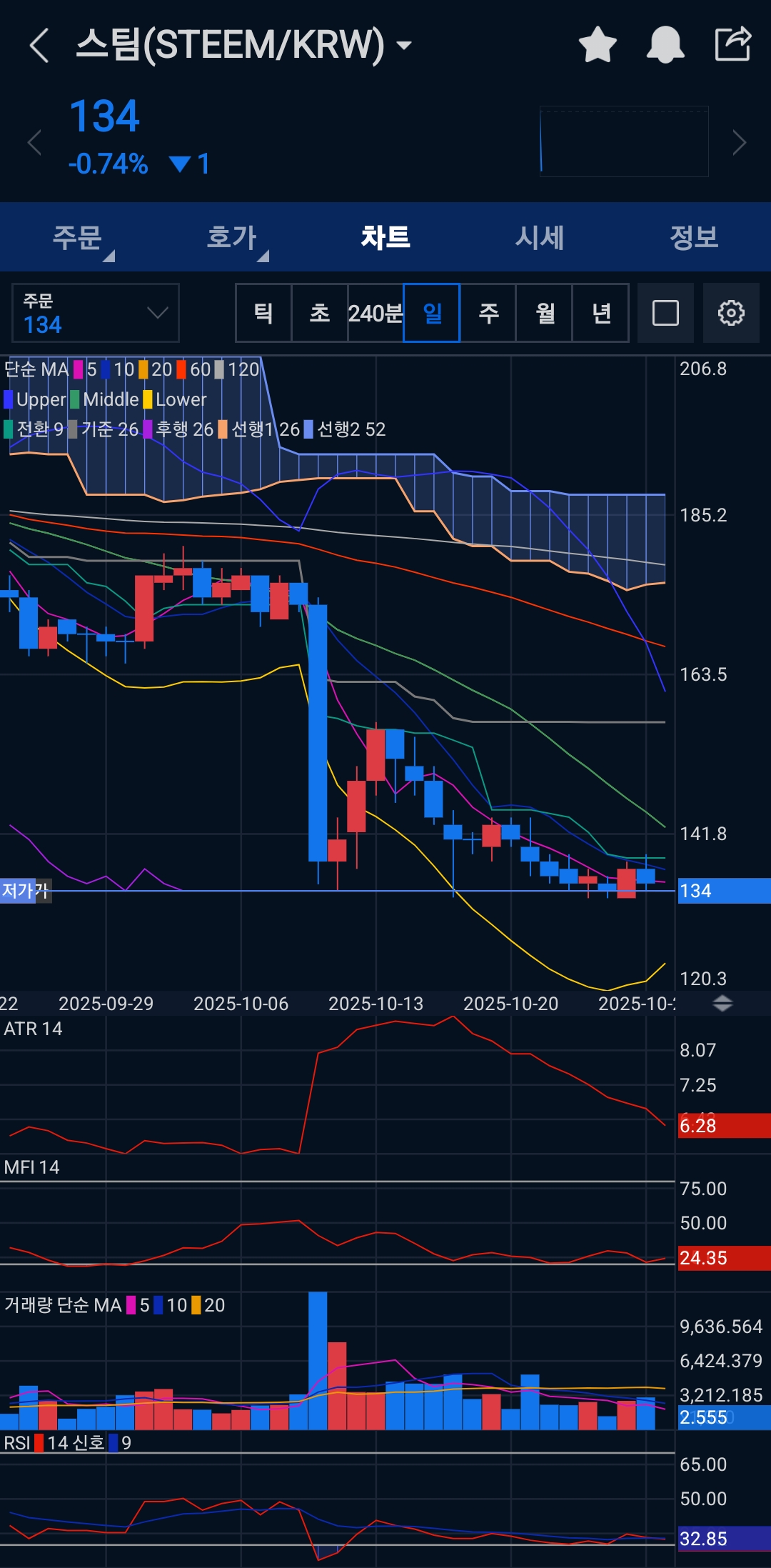 - 현재(이미지 기준) STEEM은 일·주/240분 기준 하방 구조가 유지되는 상태에서 60분 차트상 단기 횡보·분할 바운스가 나타나고 있습니다. RSI·MFI는 저점권 또는 약한 회복, ATR은 단기 변동성 소폭 축소(그러나 일간 변동성은 남아 있음) 상태로, 즉시 대규모 롱 진입보다는 확인된 신호를 기다리는 관망 또는 소규모·엄격 손절의 단기 접근이 권장됩니다.