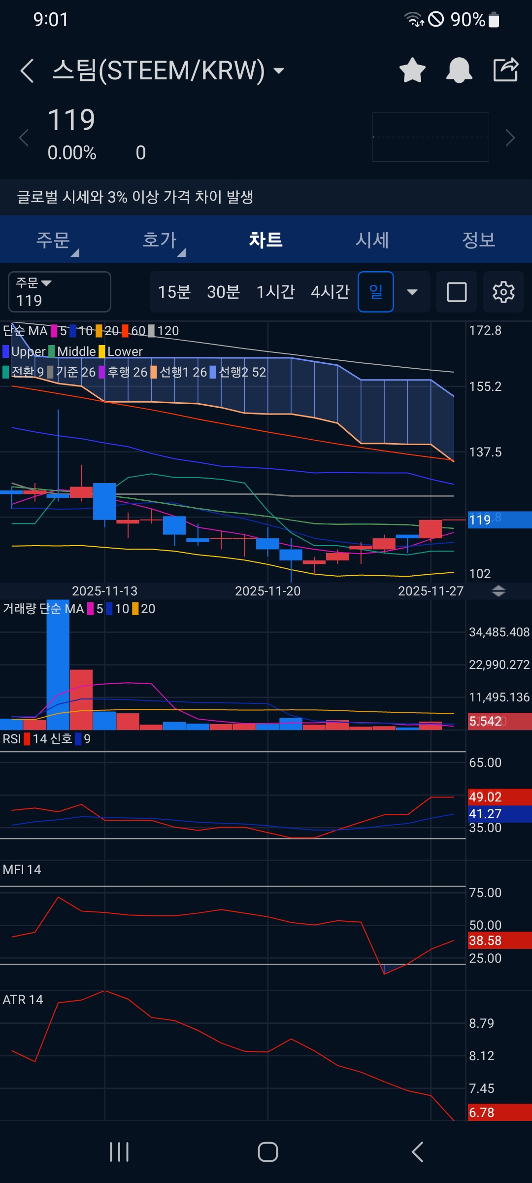 2025-11-28 오전 기준 STEEM/KRW 차트는 단기적으로 강한 상승 모멘텀과 거래량 유입이 확인되며 1시간·4시간 차트에서 정돈된 상승 흐름을 보입니다. 다만 4시간·일봉의 이치모쿠 구름대·중·장기 이동평균이 상단 저항으로 남아 있어, 중장기 추세 전환으로 보기 위해선 거래량을 동반한 명확한 저항 돌파 및 돌파 후 리테스트 성공이 필요합니다.