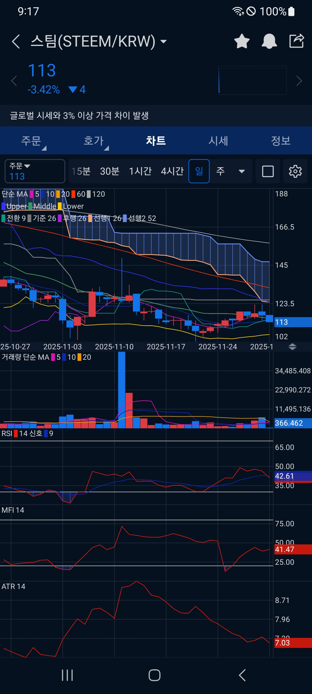 2025-12-01 오전 시점을 기준으로 스팀(STEEM/KRW) 차트는 단기(1시간)에서 횡보·정리 국면, 중기(4시간)는 구름대 접근과 거래량 회복 여부가 관건, 일봉(및 주봉)은 저점 확인 후 완만한 회복 시도 단계입니다. 단기 분할 진입·엄격한 손절·중기 돌파 확인 시 확대라는 절차적 규칙을 권장합니다.