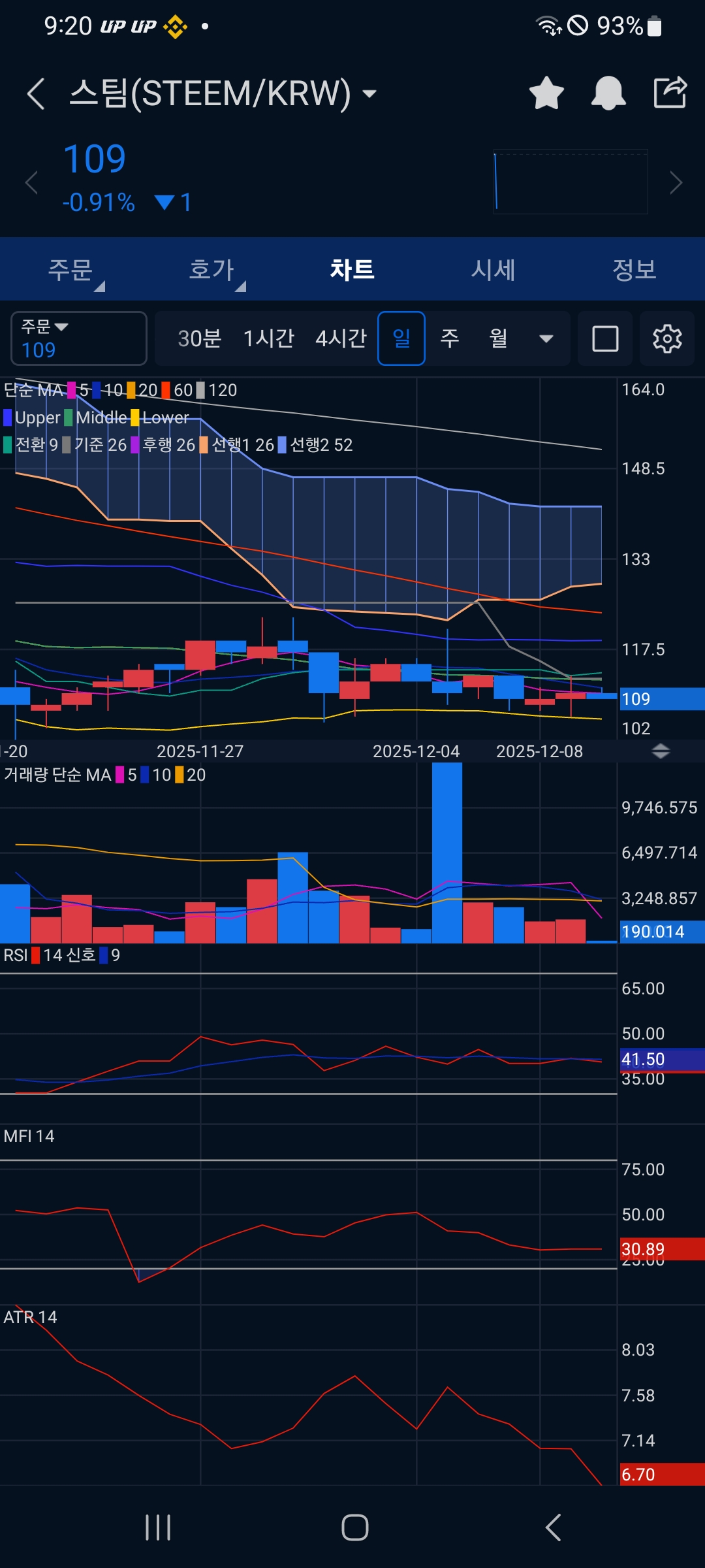 현재 화면(2025.12.10 오전 기준)에서 STEEM/KRW는 다중시간대(일봉·4시간·1시간)에서 상·중·단기 신호가 혼재되어 있으나 전반적으로는 상위 저항(이치모쿠 구름·장기 이동평균) 아래에 머물러 있어 보수적 관망을 권합니다. 단기적으로 1시간 차트에서 거래량 증가와 ATR 상승이 동반된 반등 시도가 관찰되어, 엄격한 규칙을 전제로 한 단기 롱 또는 저항에서의 리트레이스 숏이 가능하겠습니다.