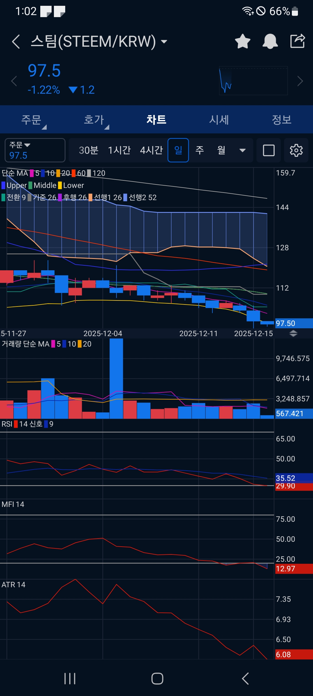 - 현재가 약 97.5원 부근(스크린샷). 직전에는 거래량 스파이크가 있었고 이후 가격이 박스권(정리 구간)으로 수렴.