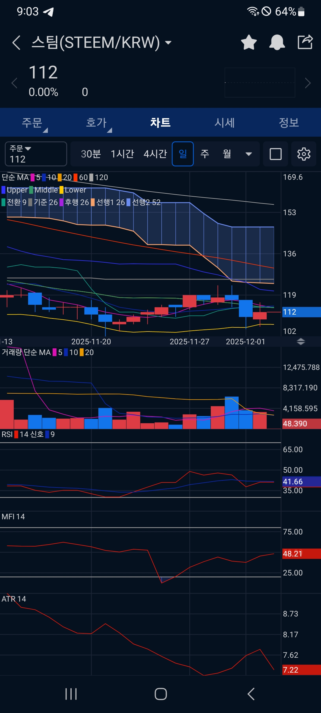 2025-12-03 업로드하신 STEEM(KRW) 차트(1시간·4시간·일봉 기준)는 단기(1시간)에서 최근 급등 뒤 정돈·저항 테스트 구간, 중기(4시간)는 구름대·이평 저항권 근접으로 확대 확인 필요, 일봉은 장기 하락축(구름대·장기 MA) 유지 속 저점권 회복 시도입니다. 당장 단기 분할매수(지지 확인) 가능하나 4시간 구간의 거래량 동반 돌파 및 일봉상의 연속 종가 확인 전에는 중·장기 비중 확대를 권하지 않습니다.