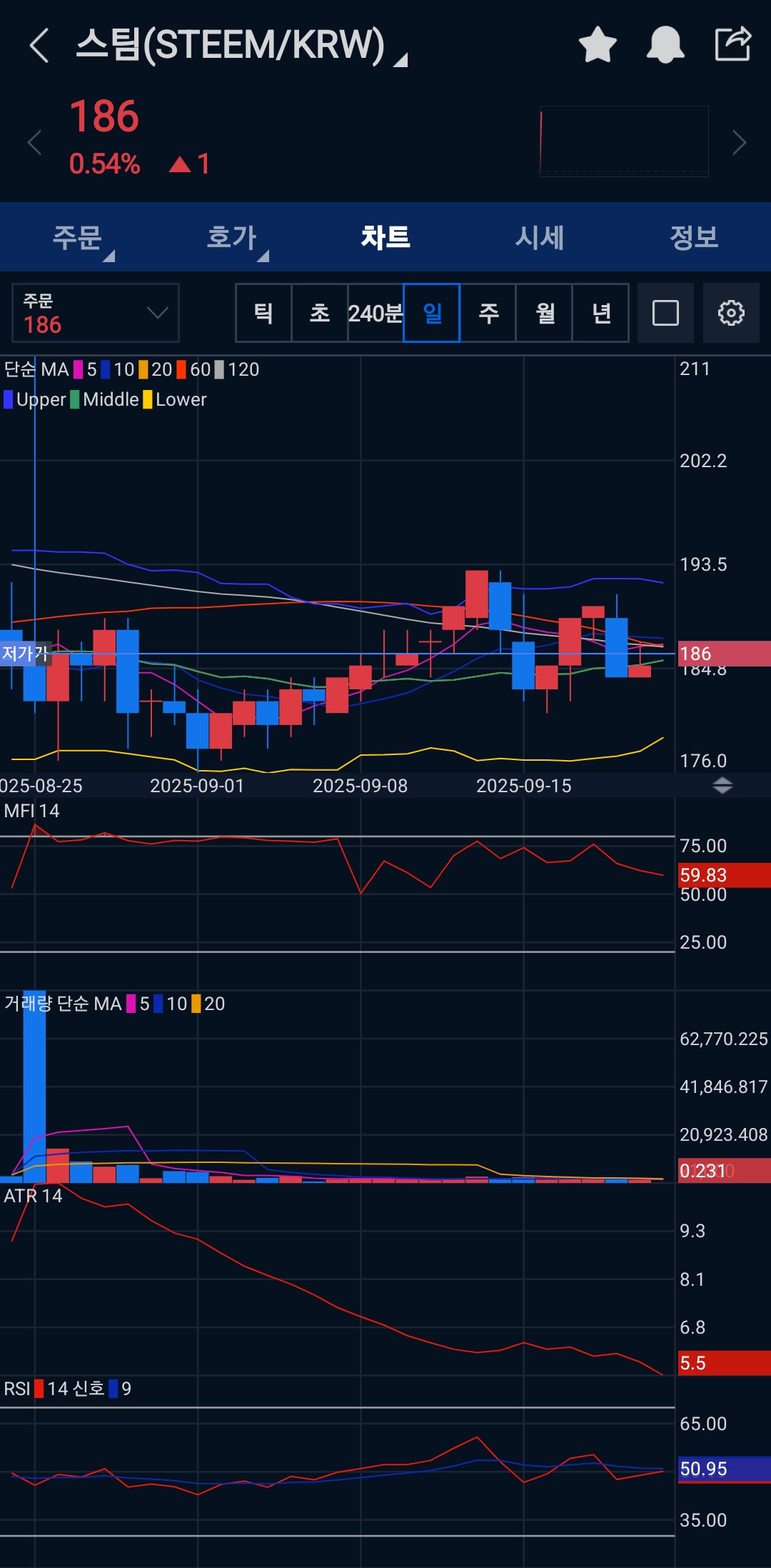 - 중단 밴드 부근에서 연속 상단 꼬리, 상단 밴드는 완만 하향. 상단 193~195, 하단 180 전후.