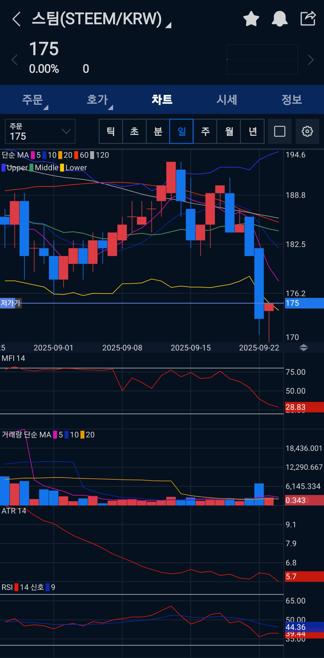 해석: 변동성 수축→추후 확장 예고. 175 축을 기준으로 방향 선택 대기.