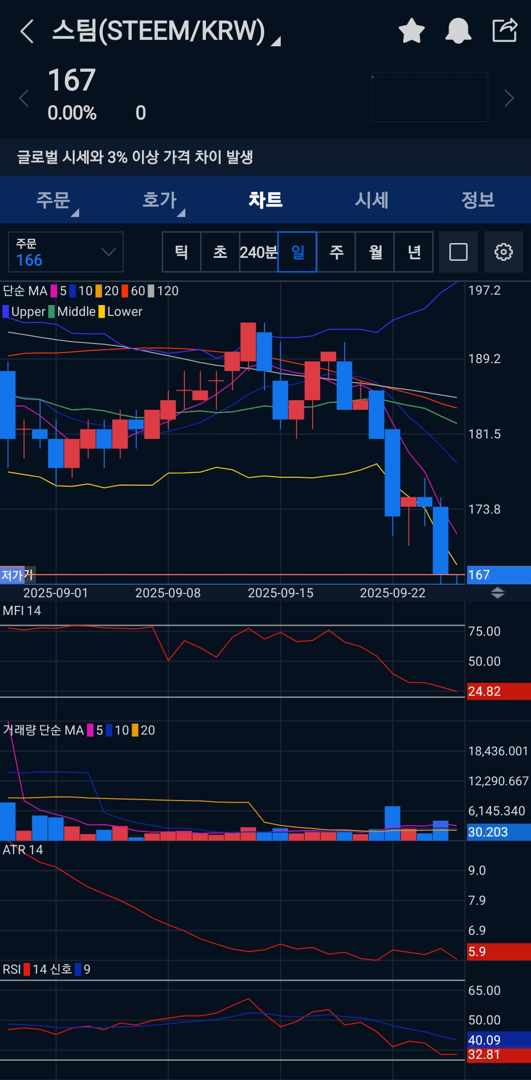 - 가격 위치: 단·중기 이평선 하방 정렬(5 < 10 < 20 < 60). 캔들은 하단 밴드 부근에서 옆걸음. 166 지지선 테스트 흔적.