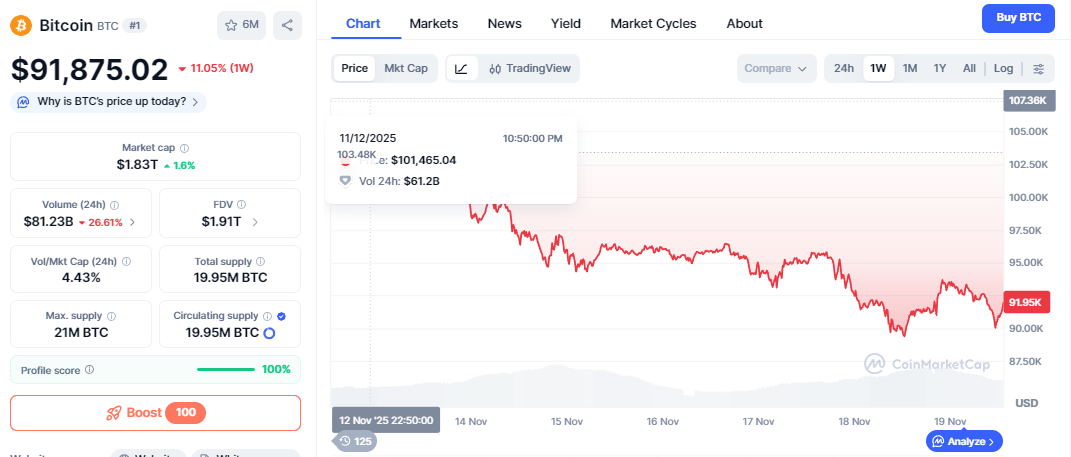 The Bitcoin price is currently moving around 91 KUS dollars, and it was there at 125K US dollars for some time, so from there, at the current price, there is a dip of 25% overall, which is quite an interesting correction on the Bitcoin prices. Correction is a normal thing in the market, and we need to understand that because it is needed for the market to grow, and it is also important because we just can't expect the market to go up and up only and with these types of Corrections, new money flows in where new people also take the entry.