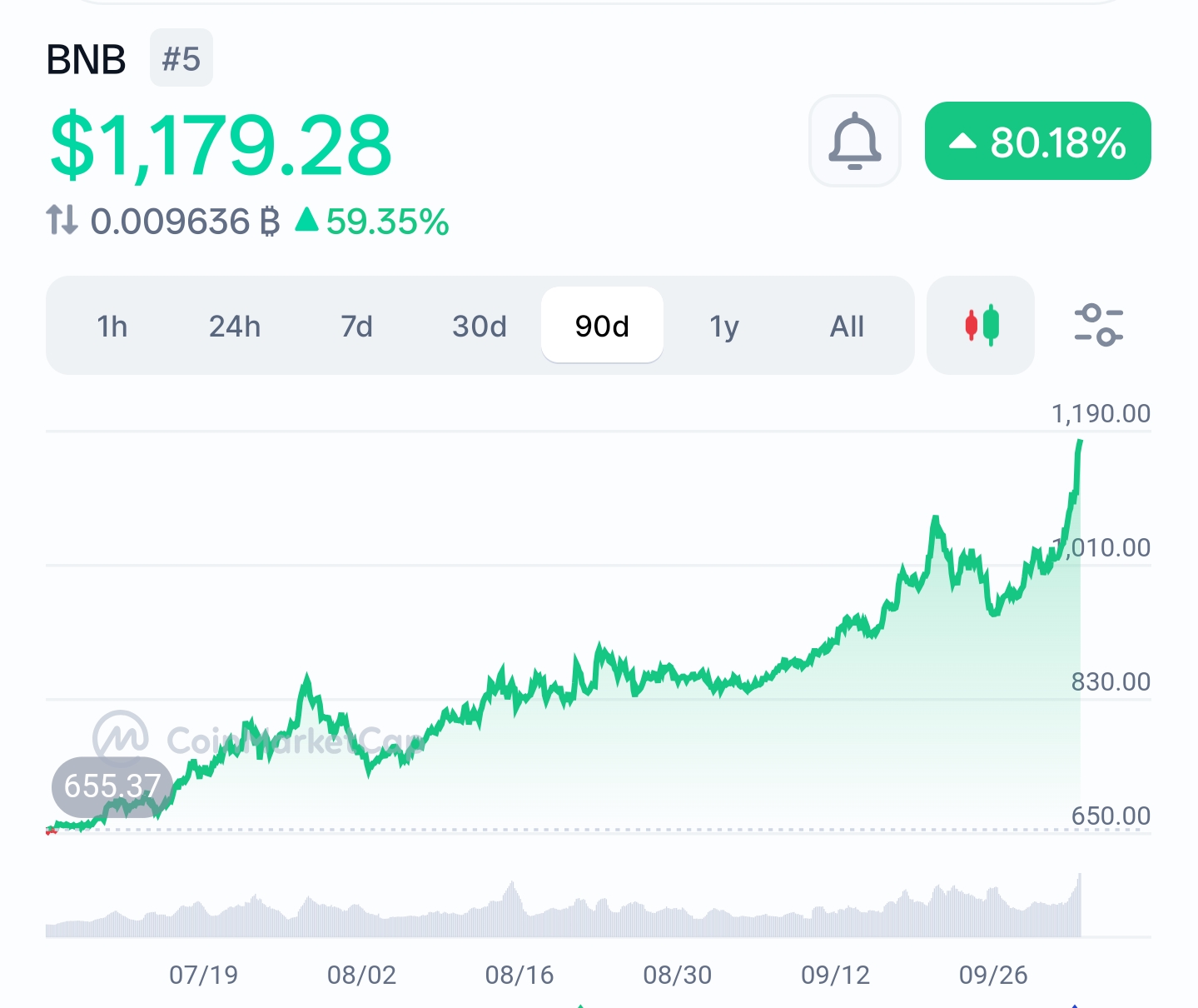 If you look at the chart above which I have shared then you will figure out that in last 90 days the value has gone up by over 80% and currently it is telling around 1179 which is not very far from 1200 and looks like it is going to be there soon which is matter of today or tomorrow so I will not be surprise if after the weekend we see BNB at 1200 US dollars.
