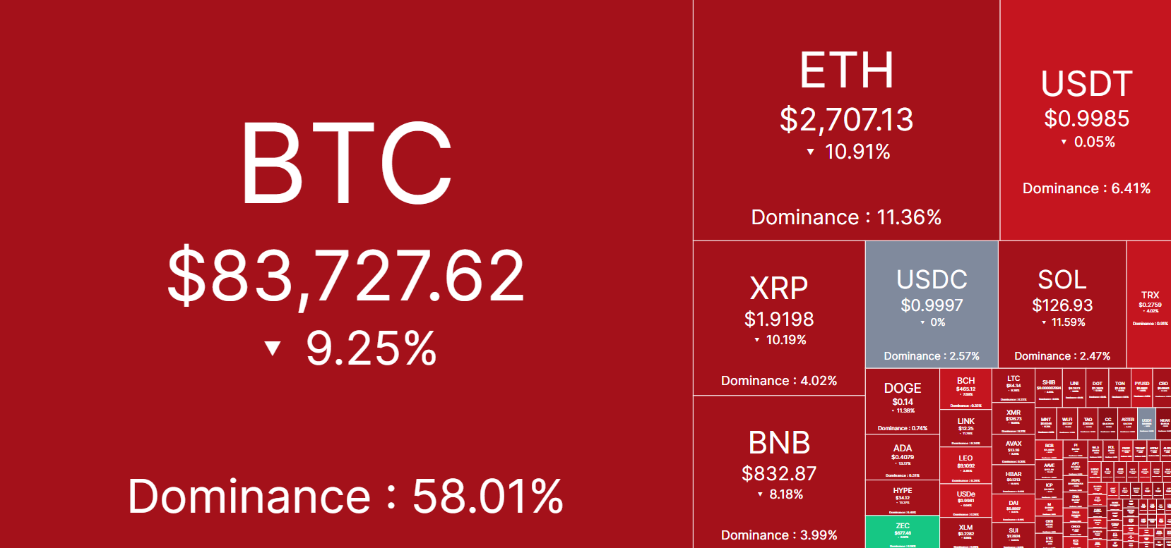 This is the current market situation right now, which you can see in this heat map, where every coin is in red except one, which is reflected in green colour, and it is called ZEC. I don't know the reason why this coin has still shown the green colour, but others are in red and that too in a bigger percentage, so this can be a signal that things are not going to be good in the market for now and even if it recovers, then also it will take time.
