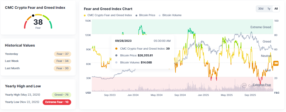This is the fear and grid index of the crypto market, and in last few days, I have seen some sort of recovery in the fear because there was a time when this number was around 15, and then some sort of correction was seen, and this number was increased to 20 and 25, followed by 30, and now it is at 38.