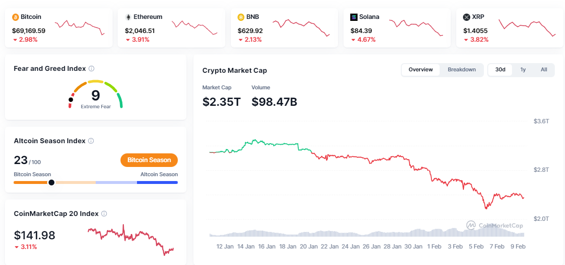 The current situation is more alarming because this index is at 9, and I have not seen this number sincea longtime because the last time I have seen in 2025, which was 15, but currently at 9 is a really alarming situation in the crypto market. Even the global market cap is reduced, and currently it is at 2.35 trillion, which was more than $3 trillion for a long time.