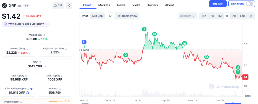 If you are an XRP coin holder, then probably this price chart can be a little bit frustrating for you because the current price is very low compared to what we have seen last year for the XRP price in the market. if you go through the chart then you will be able to see that in July and August this coin was doing great and we have seen a high price for this coin which is 3.4 dollar in July month 2025 But now the current price is less than one and a half dollar and if I need to be precise then it is 1.42 dollar which is $2 less than what we have seen the high price in last year.