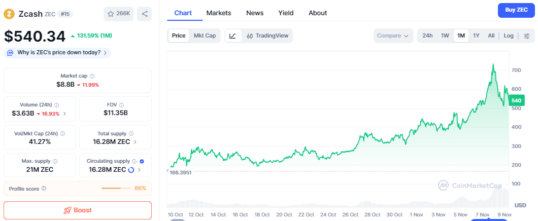 This is one of the coins that has caught my attention, and it is not just me—there are a lot of people in the market talking about this coin, which is called Z Cash. It is the coin that has shown a significant price momentum in a very short amount of time, and all you can see on the below price chart where you can see how it started from less than $200 in 10th October and within a month now it is more than 500 US dollars where it has also test the price of $700 for some time.