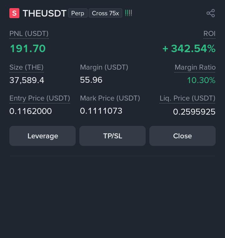 The Liquidation Price (0.2595925). Your trade will be automatically closed and you will lose $55.96 in margin if the price of THE reaches this level.