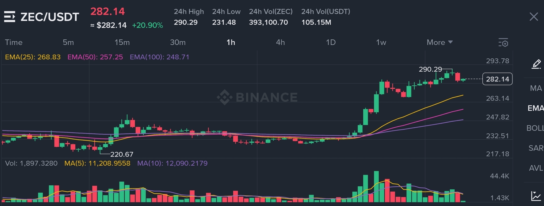 ZEC/USDT on Binance just surged +20.90% in 24 hours to $282.14, hitting a high of $290.29 with massive volume, 393,100 ZEC traded + $105.15M USDT.